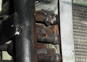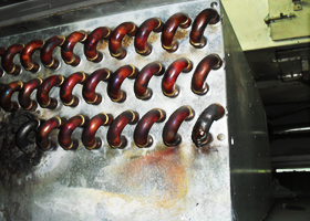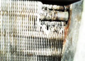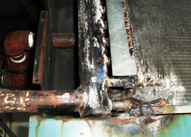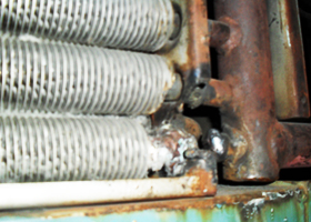 คอยล์แลกเปลี่ยนความร้อน ระบบไอน้ำที่เสื่อมสภาพ แตก รั่ว ไม่สามารถทนแรงดันได้เมื่อแตกรั่ว การเชื่อมอุดรอยรั่ว เพื่อใช้งาน ทำได้ยากมาก เนื่องจาก ท่อทองแดงในแผงคอยล์เสื่อมสภาพ มีการกัดกร่อนจากไอน้ำ ผิวท่อบาง และมีความชื้น เป็นอุปสรรคในการเชื่อม เชื่อมอุดไม่อยู่ หรือแตกรั่วเพิ่มในจุดอื่นๆ